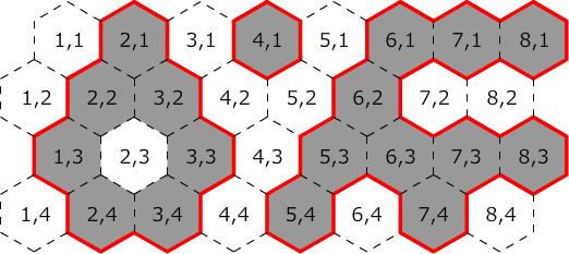 一度、周りに新しく土地を作って、BFSを実行することで、赤枠の外側の白色の六角形を判定することが出来ました